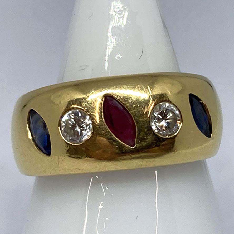 サファイアを銀座で買取。K18 750 0.21 ダイヤ×ルビー×サファイア リング 7.9gを買取りました。