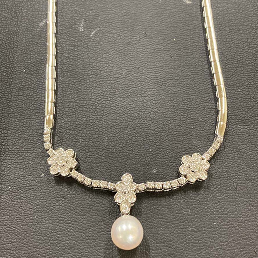 ダイヤモンドを銀座で買取。K18WG 24.1→23g 40Pダイヤ 1Pパール フラワーモチーフネックレスを買取りました。