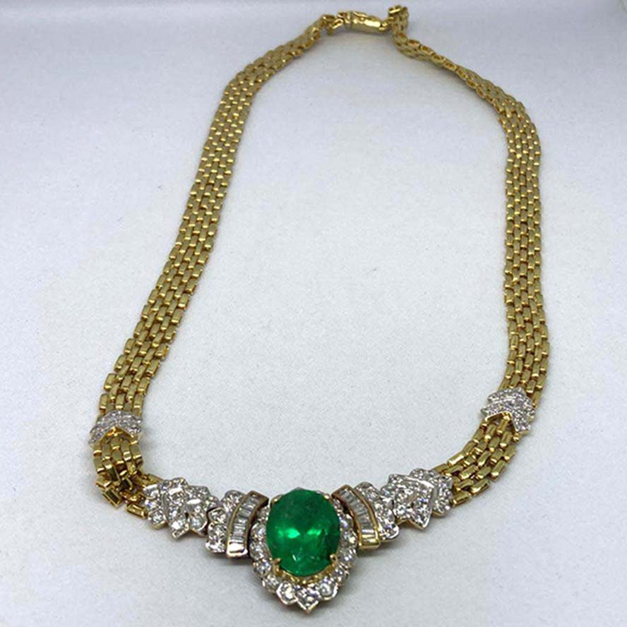 銀座でダイヤモンドを買取。K18 ダイヤ 2.15ctエメラルド 6.59ct 53.3g ネックレスを買取りました。