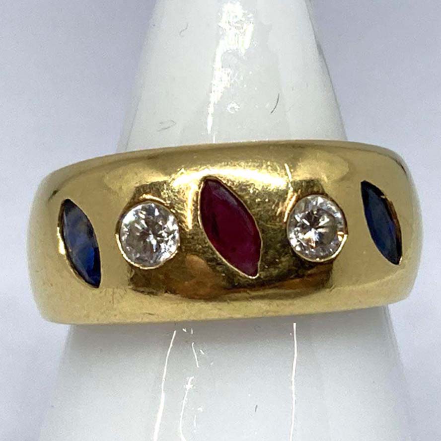 銀座でダイヤモンドを買取。K18 750 0.21 ダイヤ×ルビー×サファイア リング 7.9gを買取りました。